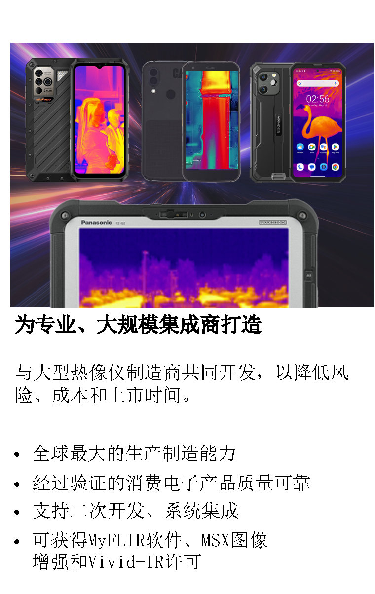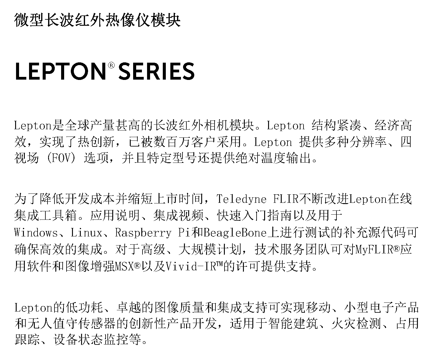 为了降低开发成本并缩短上市时间,Teledyne FLIR 不断改进 Lepton 的在线集成工具箱。应用说明、集成视频、快速入门指南,以及用于在 Windows、Linux、Raspberry Pi 和 BeagleBone 上进行测试的补充源代码可确保高效的集成。对于高级、大规模计划,技术服务团队可对 MyFLIR® 应用软件和图像增强 MSX®,以及 Vivid-IR™ 的许可提供支持。